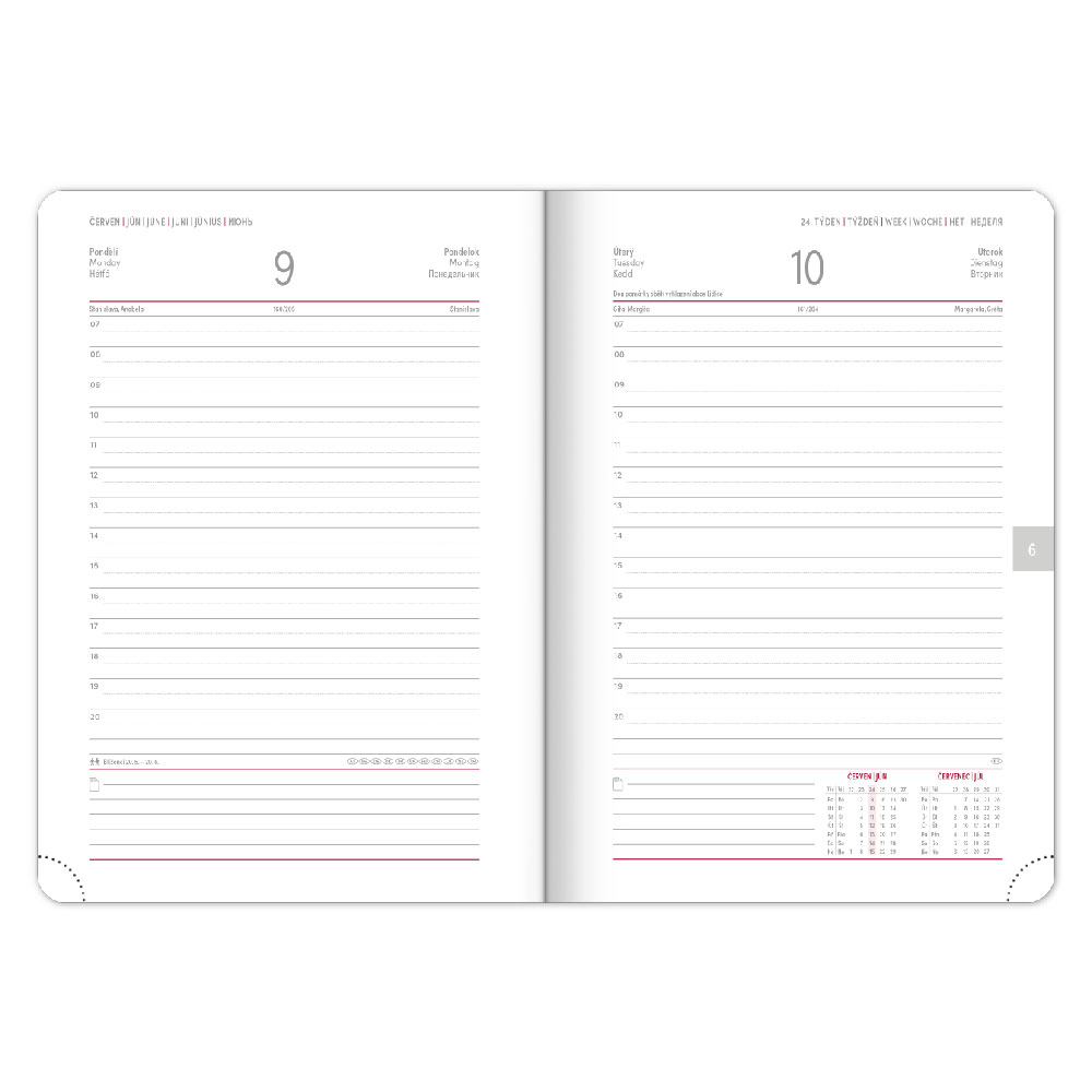 Diář obsahuje: místo pro osobní údaje, měsíční plánování 2024 a 2025,
