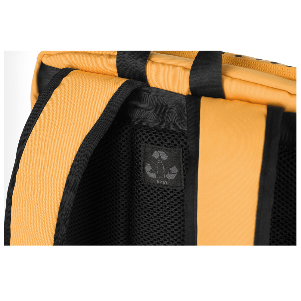 • Tento batoh vrací do života plastové láhve, ze kterých by se jinak stal odpad. Výsledný materiál je lehký, odolný a dlouho vydrží.