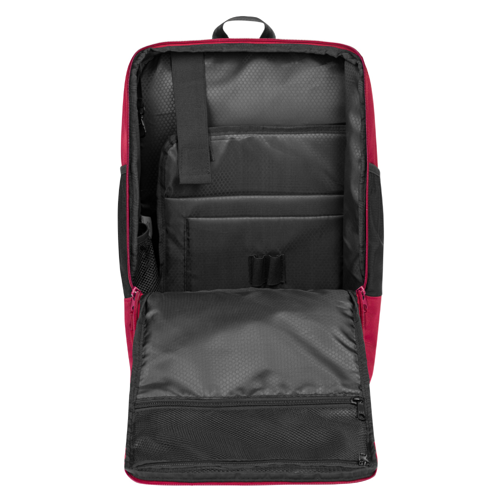 • Ideální na cesty jako příruční zavazadlo do letadla. Další výhodou je zádový pruh, který slouží k fixaci batohu na madlech kufru.