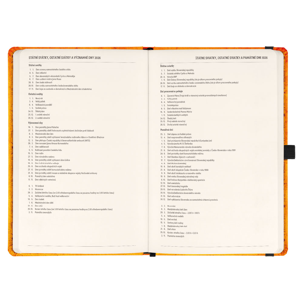 Součástí je záložka, poutko na tužku a vnitřní kapsa.