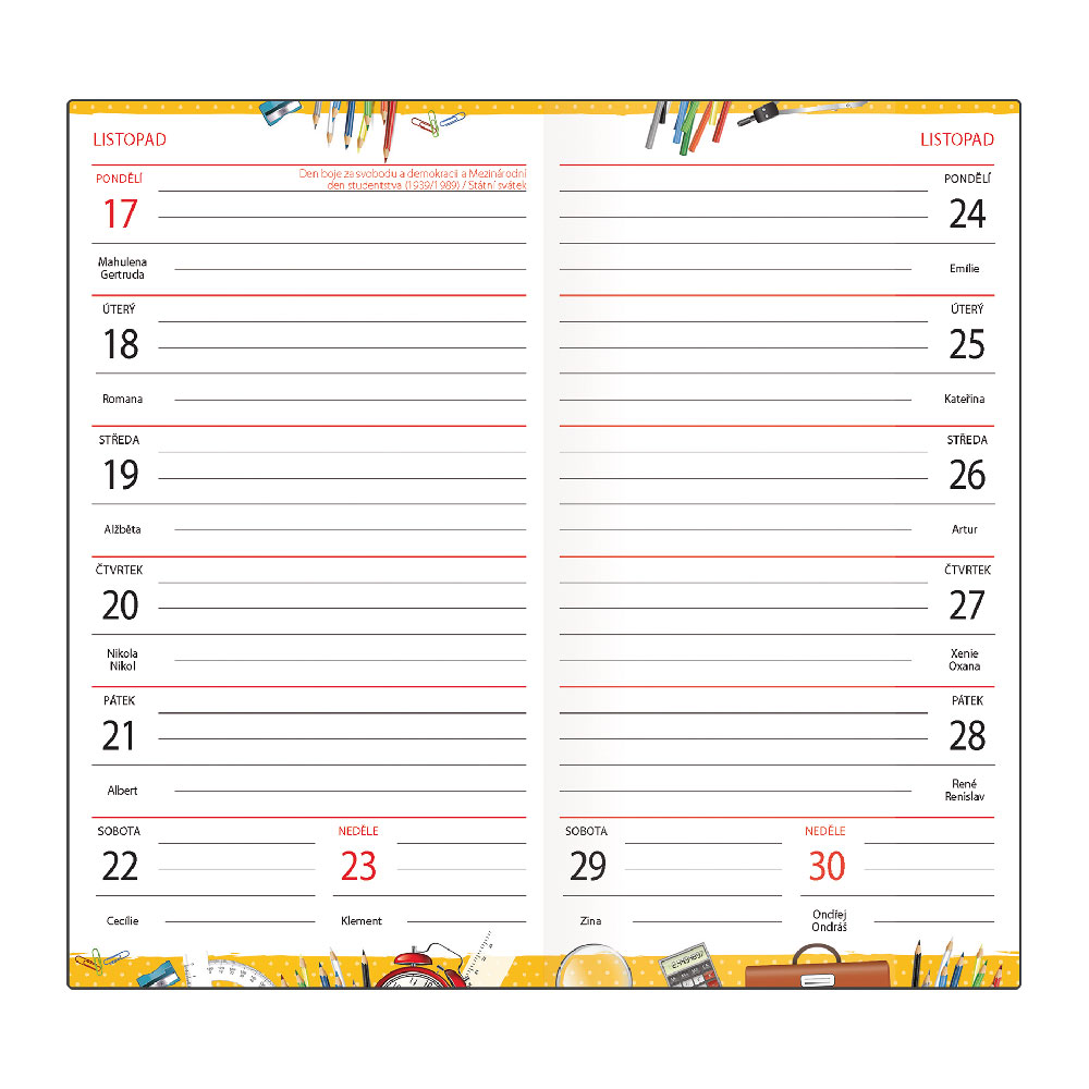Obsahuje: rozvrh hodin, pravítko, adresář,