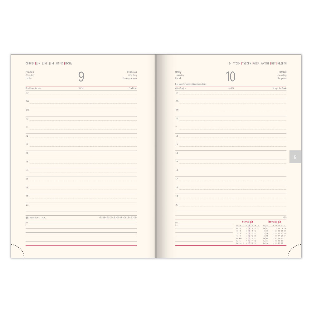 Diář obsahuje: místo pro osobní údaje, měsíční plánování 2024 a 2025,