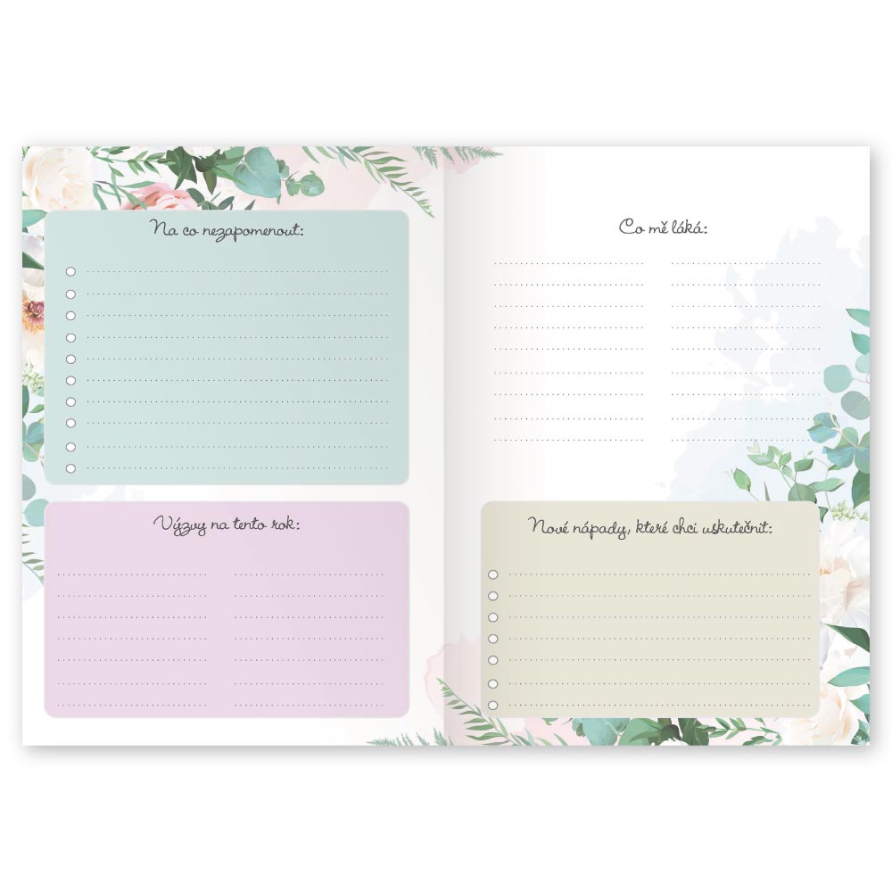 Součástí je gumička na zavírání, záložka, tři aršíky kreativních samolepek.