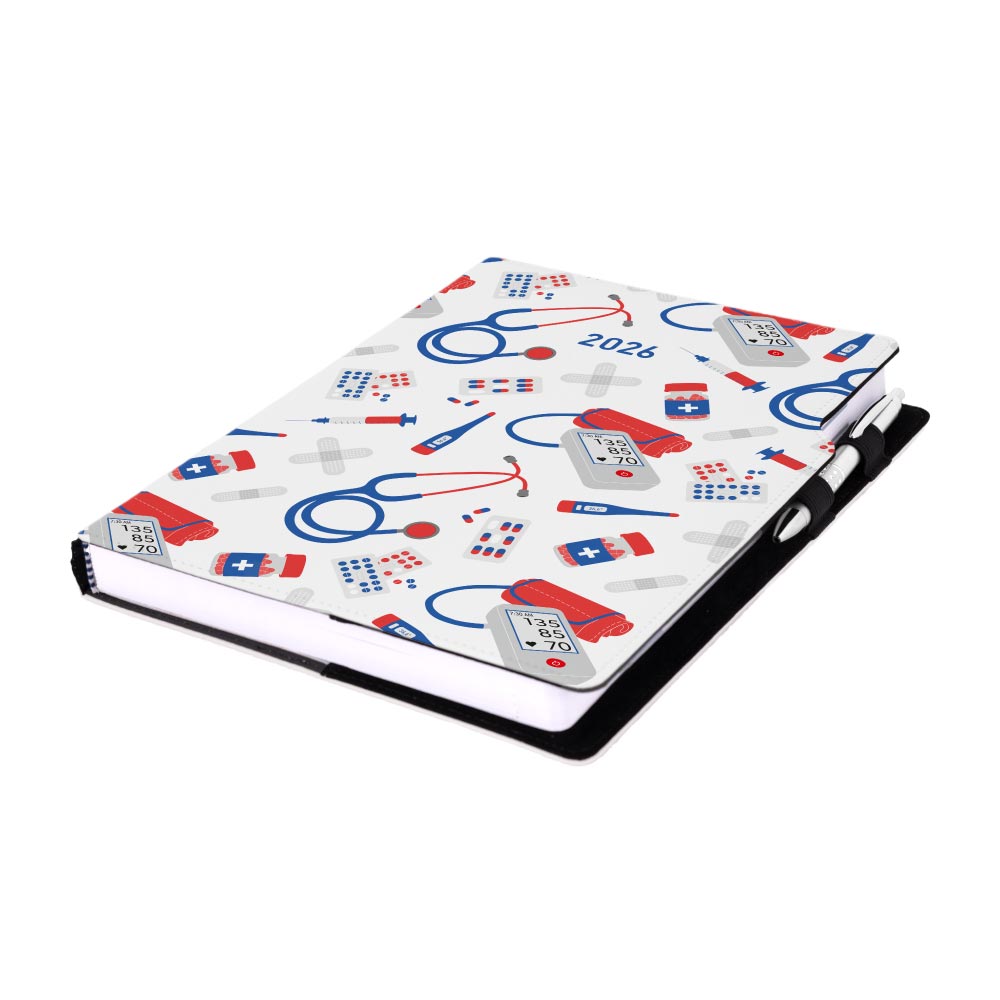 Diář obsahuje: kulaté odtrhávací rožky, bílou záložku a propisku