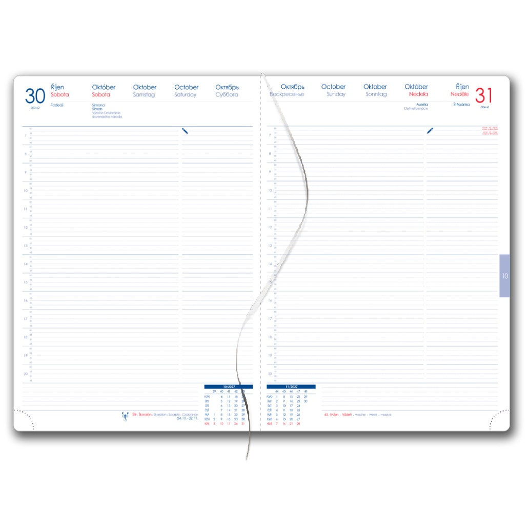 Diář obsahuje: kulaté odtrhávací rožky, bílou záložku a propisku