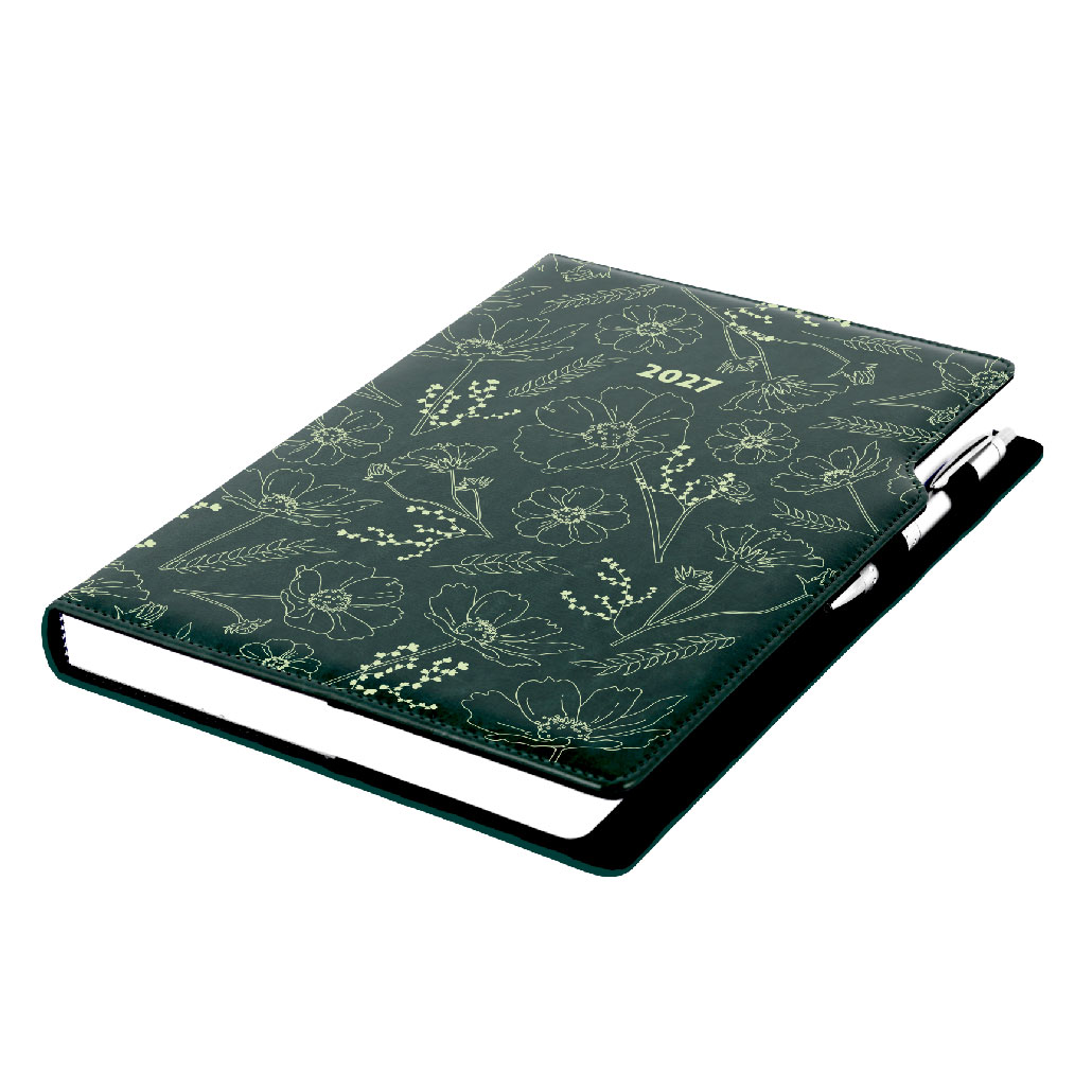 Diář DESIGN denní A4 2027 - zelená - Květiny