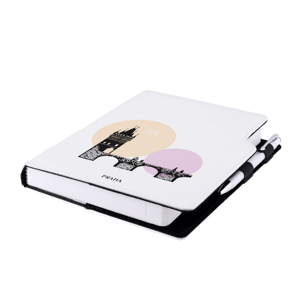 Diář obsahuje: kulaté odtrhávací rožky, bílou záložku a propisku