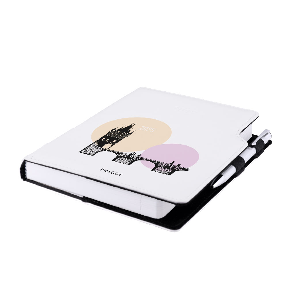 Diář obsahuje: kulaté odtrhávací rožky, bílou záložku a propisku