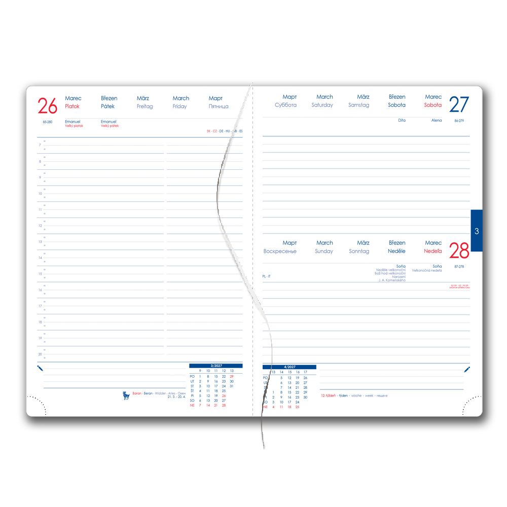 Diář obsahuje: kulaté odtrhávací rožky, bílou záložku a propisku