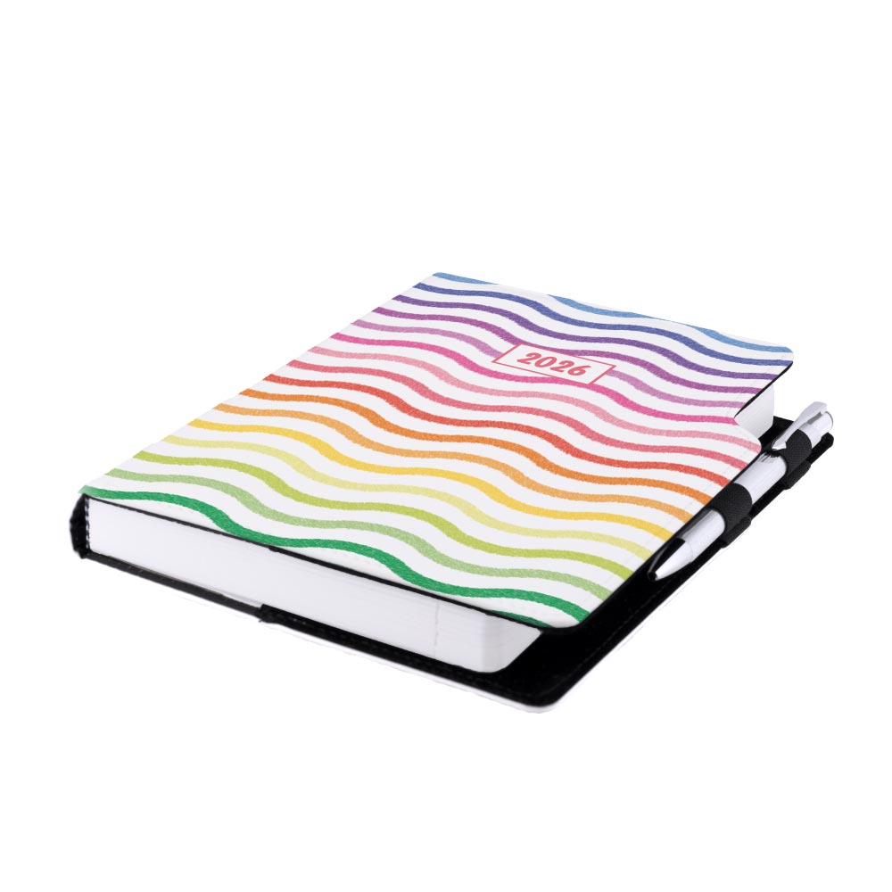 Diář obsahuje: kulaté odtrhávací rožky, bílou záložku a propisku