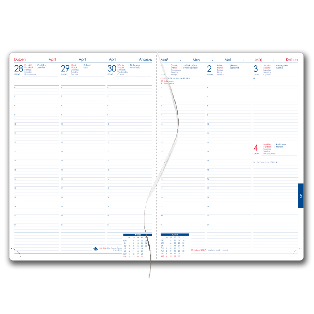 Diář obsahuje: kulaté odtrhávací rožky, bílou záložku a propisku