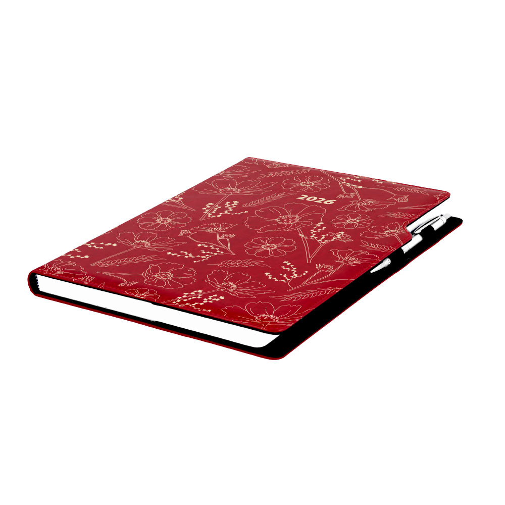 Diář DESIGN týdenní A4 2026 - bordó - květiny