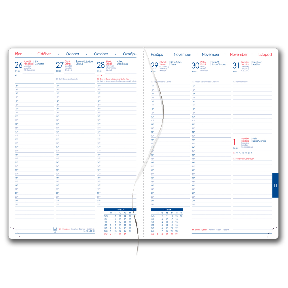 Diář obsahuje: kulaté odtrhávací rožky, bílou záložku a propisku
