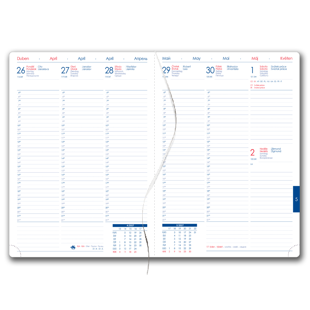 Diář obsahuje: kulaté odtrhávací rožky, bílou záložku a propisku