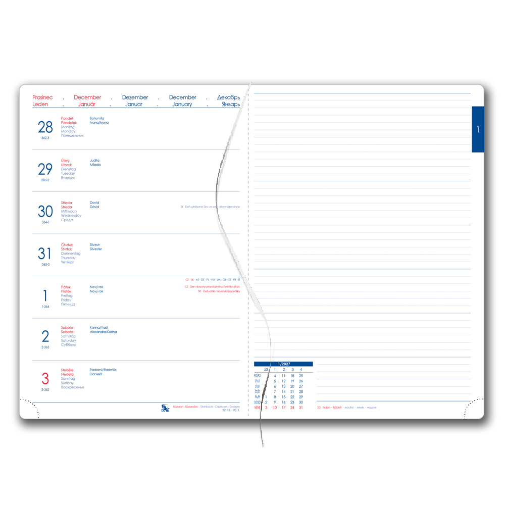 Kalendárium: týdenní jmenné CZ/SK na jedné straně + samostatná strana na poznámky