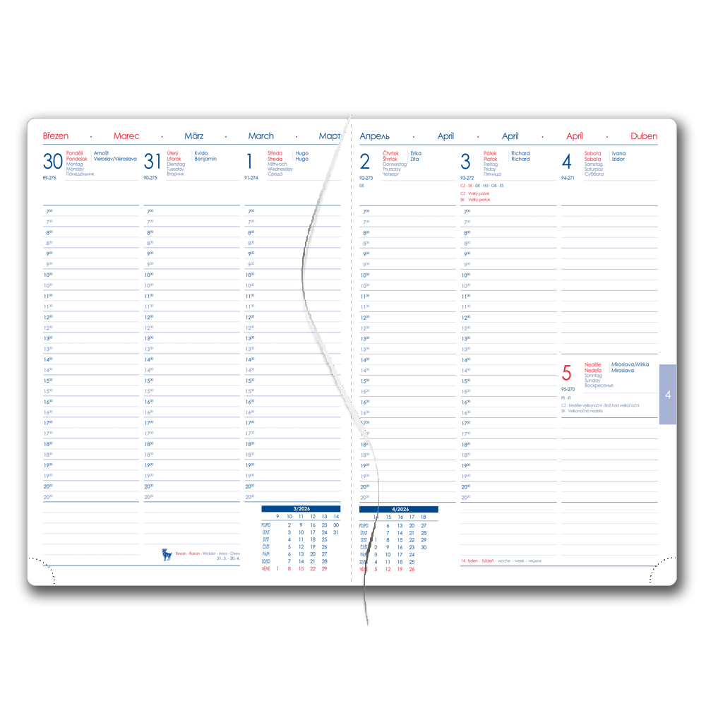 Diář obsahuje: kulaté odtrhávací rožky, bílou záložku a propisku