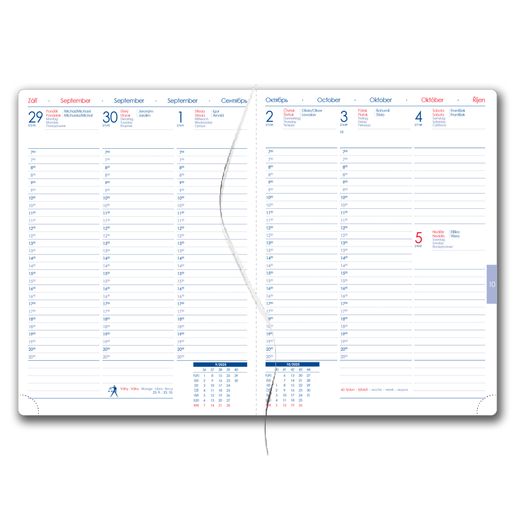 Diář obsahuje: kulaté odtrhávací rožky, bílou záložku a propisku