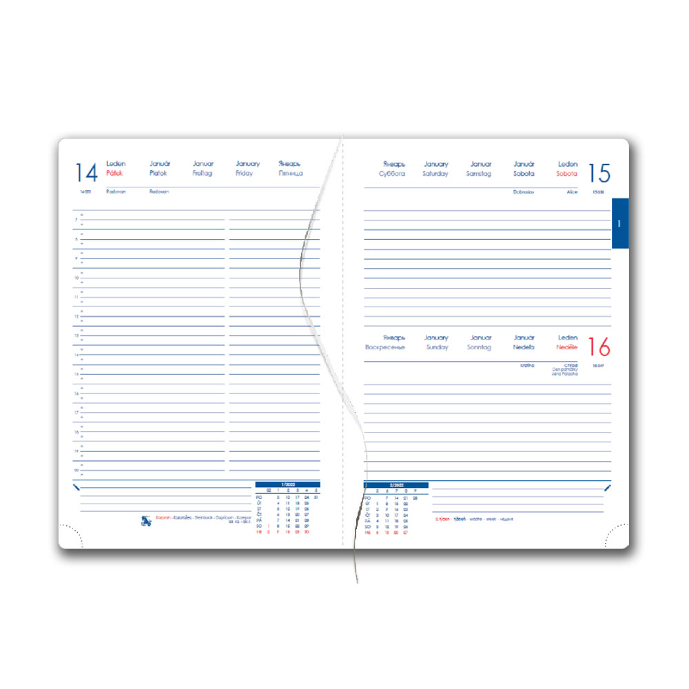 Diář obsahuje: kulaté odtrhávací rožky, bílou záložku a propisku