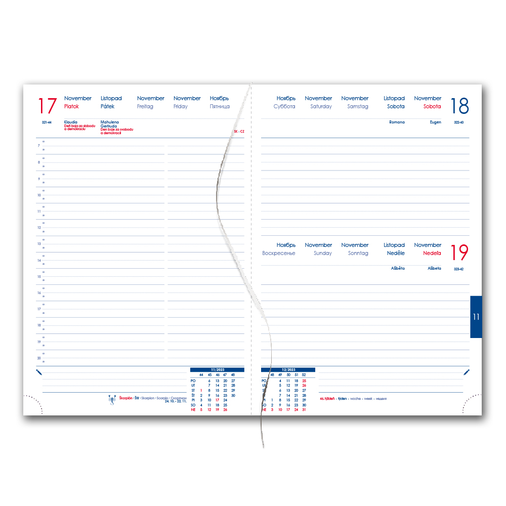 Diář obsahuje: kulaté odtrhávací rožky a bílou záložkuu