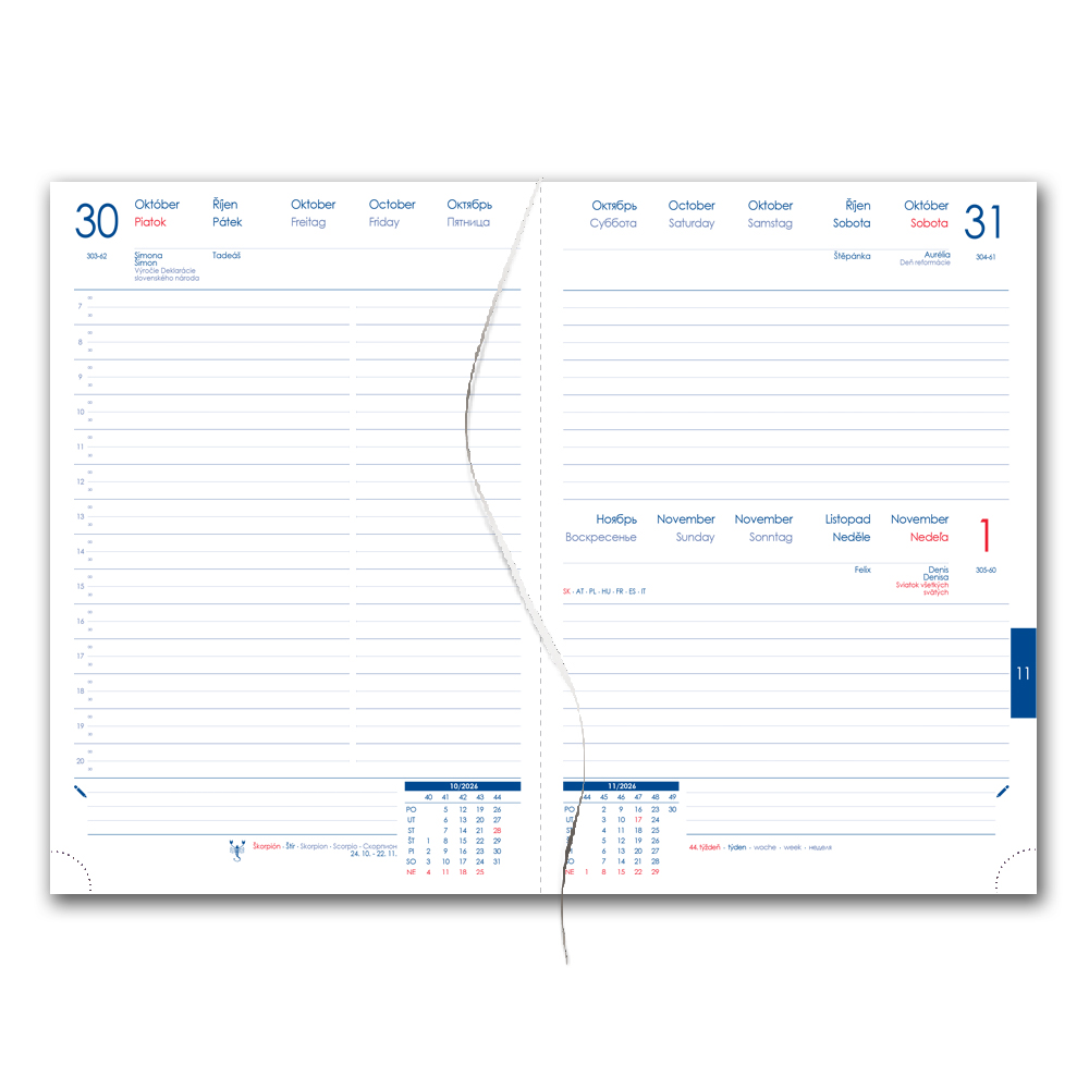Diář obsahuje: kulaté odtrhávací rožky a bílou záložkuu