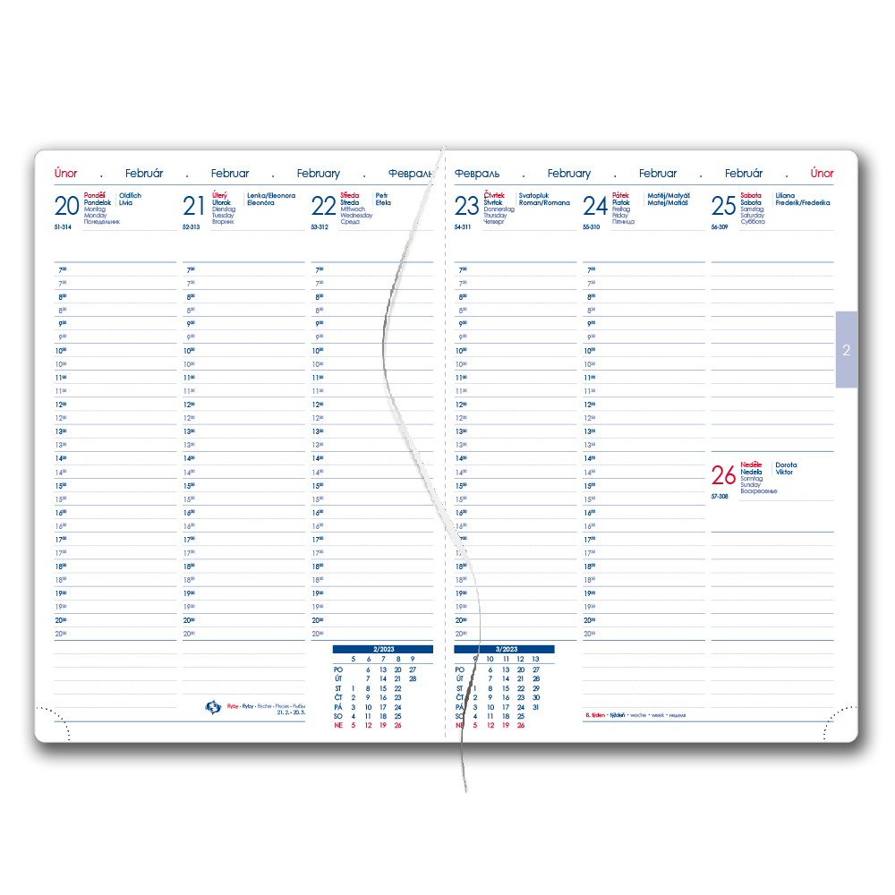 Diář obsahuje: kulaté odtrhávací rožky, bílou záložku,