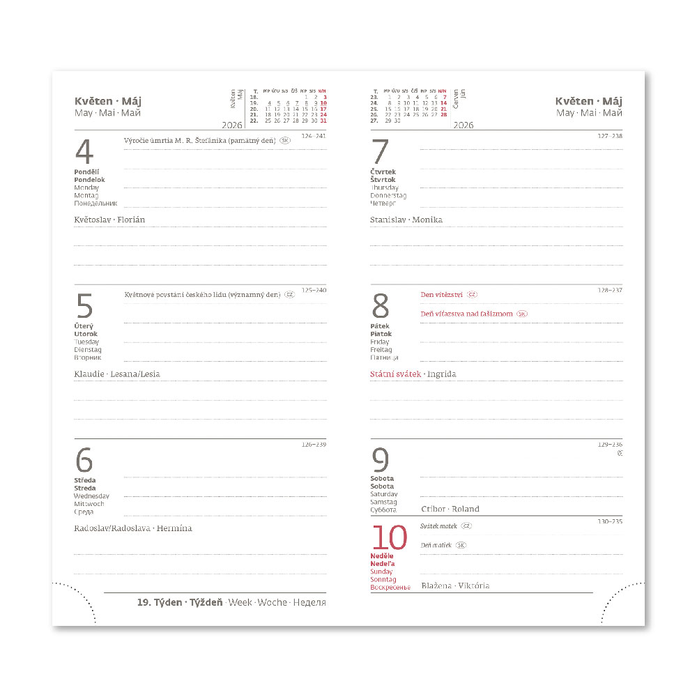 mezinárodní svátky, roční výhled, týdenní layout, adresář.
