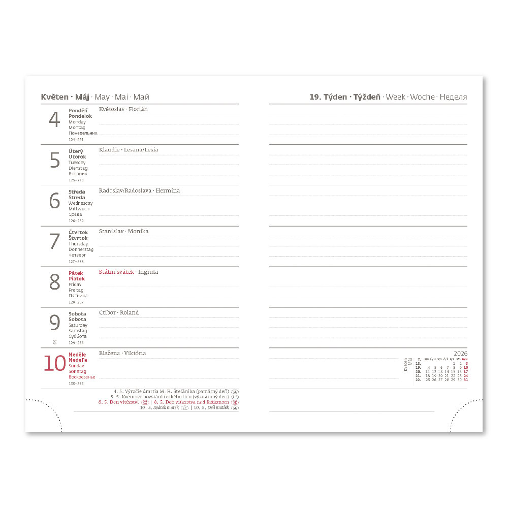 mezinárodní svátky, roční výhled, týdenní layout, adresář.