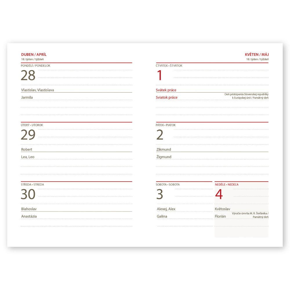 mezinárodní svátky, roční výhled, týdenní layout, adresář,