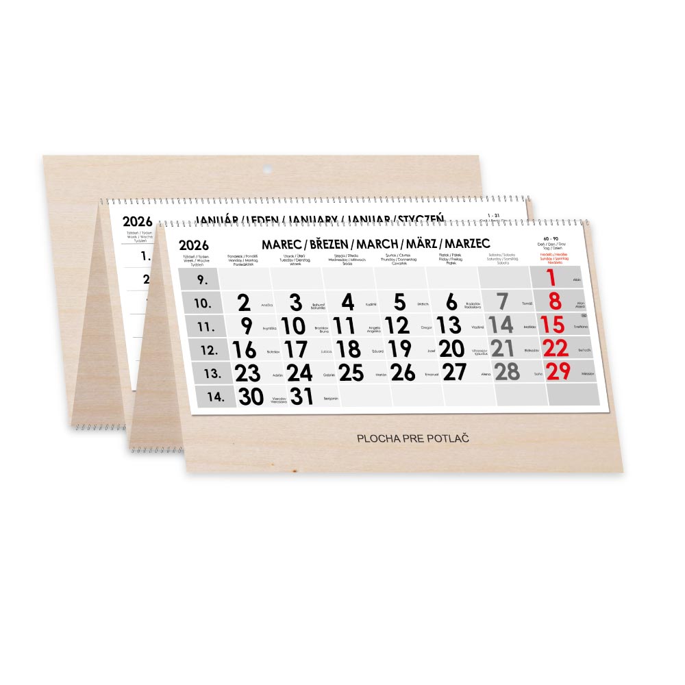 Dřevěný čtyřměsíční kalendář Kvatro Wood skládaný Slovenský se spirálou 2026 - šedý