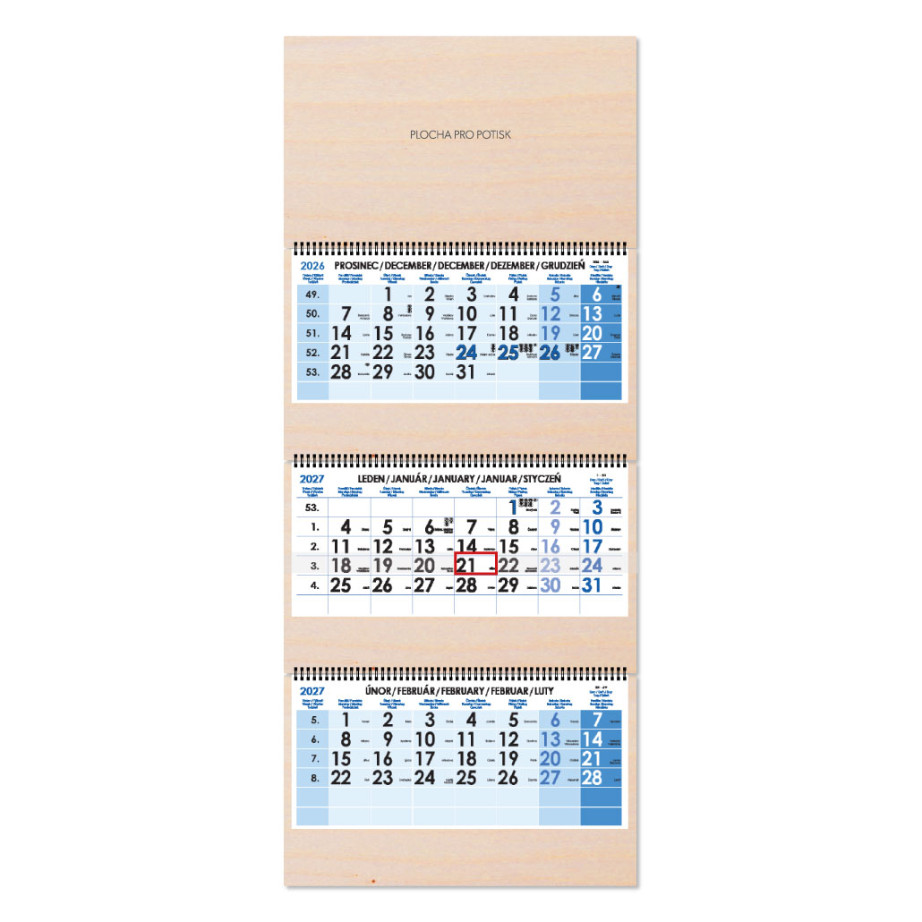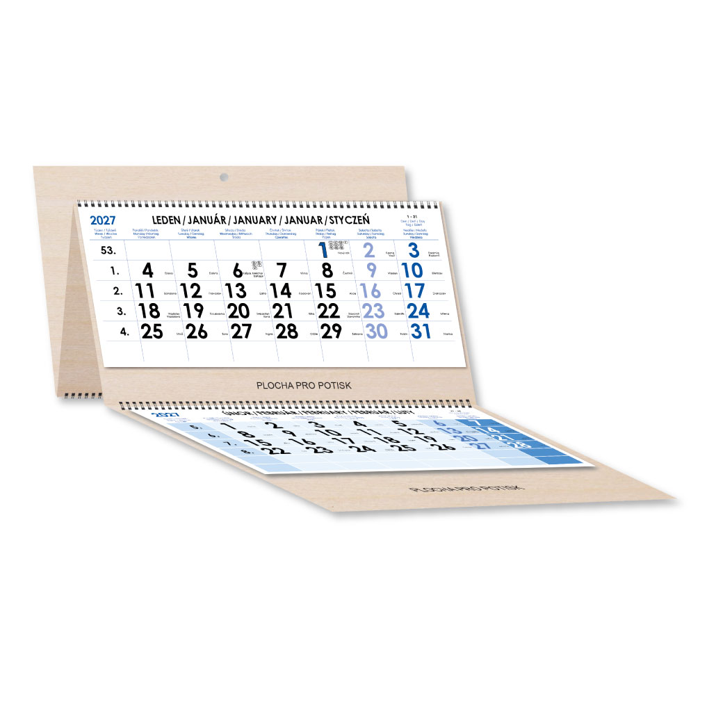 Dřevěný tříměsíční kalendář Trio Wood skládaný český se spirálou 2027 - modrý