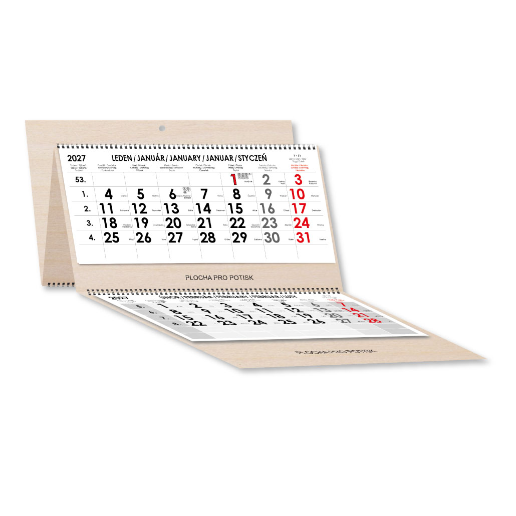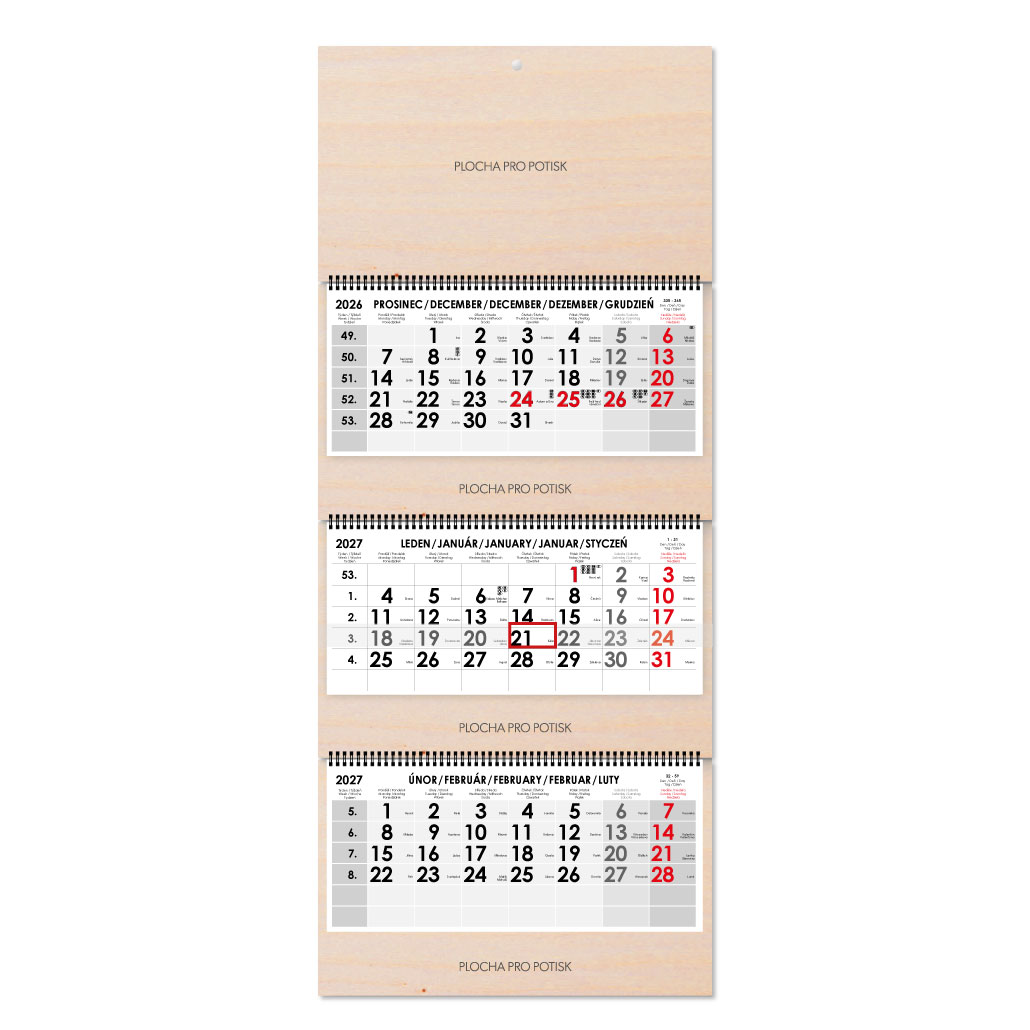 Dřevěný tříměsíční kalendář Trio Wood skládaný český se spirálou 2027 - šedý