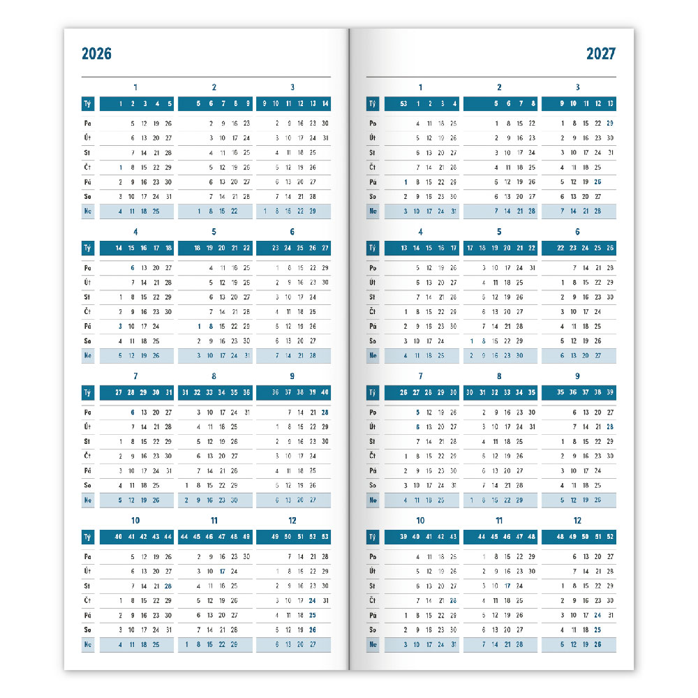 Diář obsahuje: přehledný kalendář 2026 a 2027,