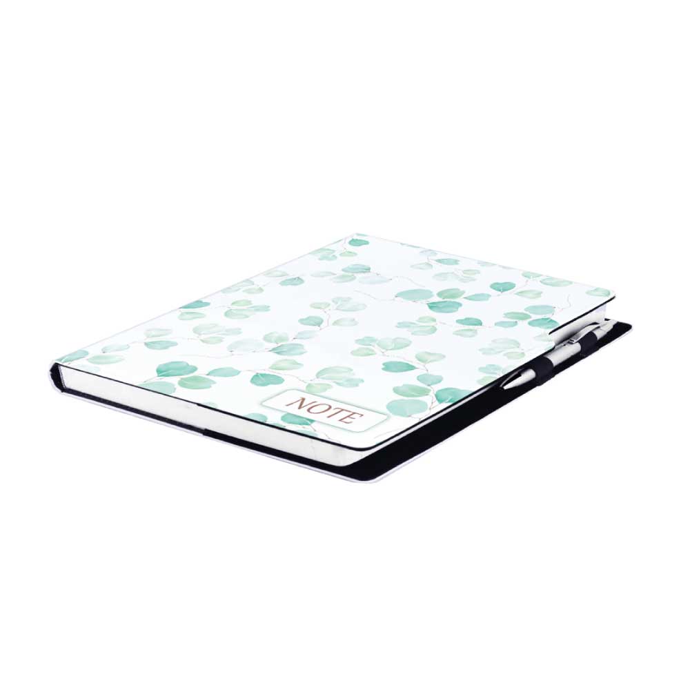 Součástí notesu je poutko na propisku a kovová propiska.