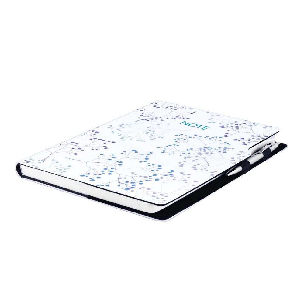 Součástí notesu je poutko na propisku a kovová propiska.