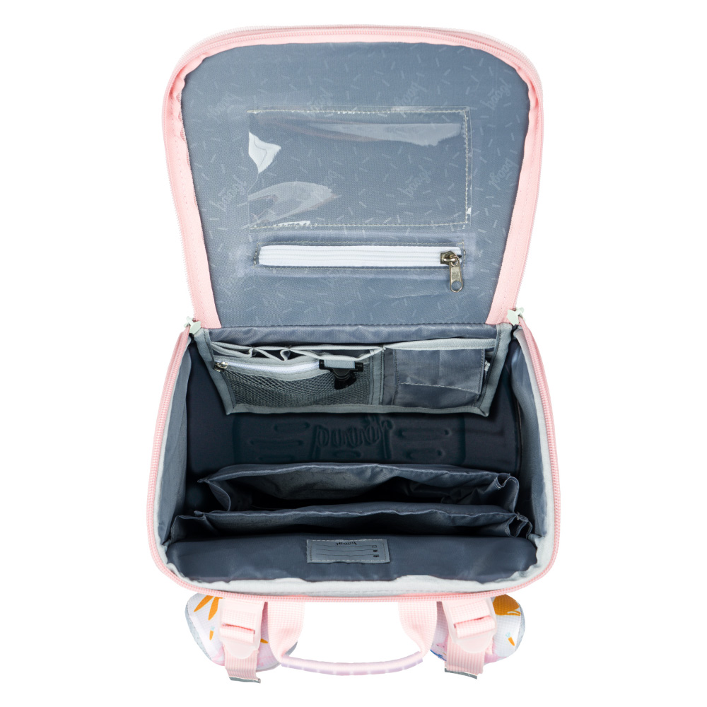 • Uvnitř aktovky je průhledná kapsa s rozvrhem a vnitřní organizér umožňující rovnoměrné rozložení hmotnosti, doplněný gumičkou pro fixaci.