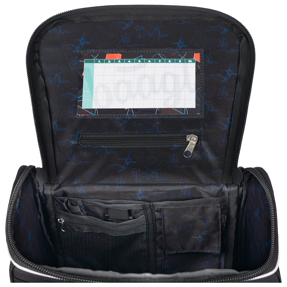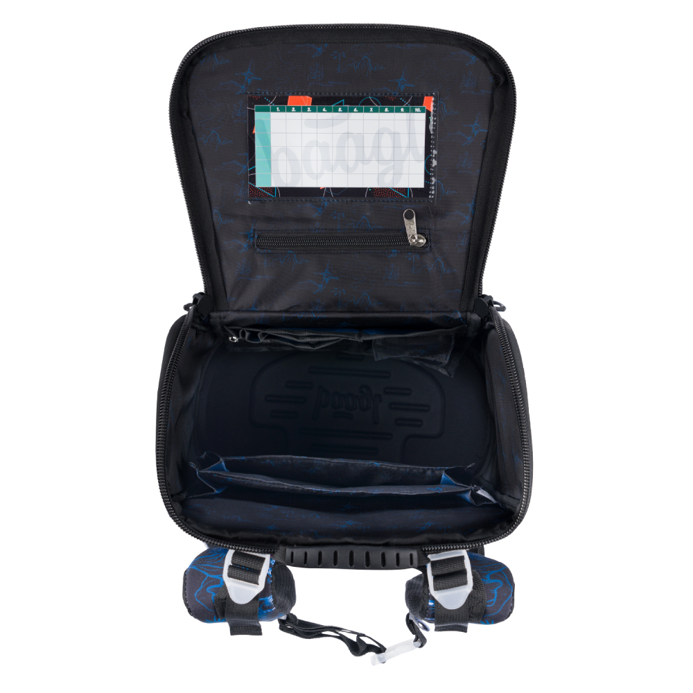 • Uvnitř aktovky je průhledná kapsa s rozvrhem a vnitřní organizér umožňující rovnoměrné rozložení hmotnosti, doplněný gumičkou pro fixaci.