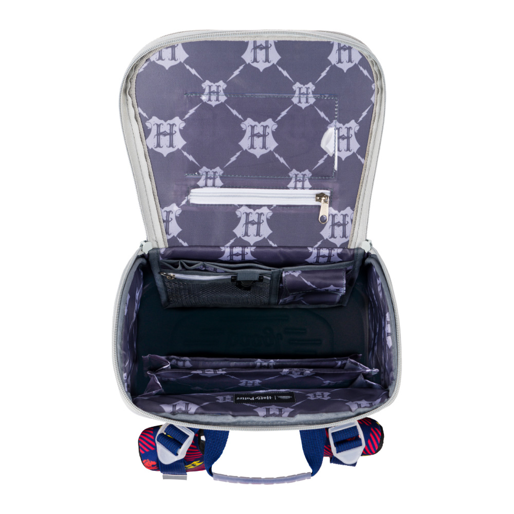 • Uvnitř aktovky je průhledná kapsa s rozvrhem a vnitřní organizér umožňující rovnoměrné rozložení hmotnosti, doplněný gumičkou pro fixaci.