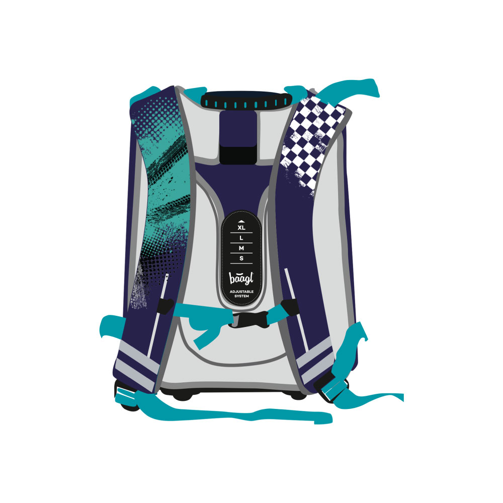 • Posuvný zádový systém BAAGL ADJUSTABLE SYSTEM umožňuje nastavení optimální polohy popruhů vzhledem k výšce dítěte.