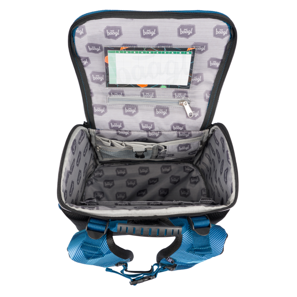 • Uvnitř aktovky je průhledná kapsa s rozvrhem a vnitřní organizér umožňující rovnoměrné rozložení hmotnosti, doplněný gumičkou pro fixaci.