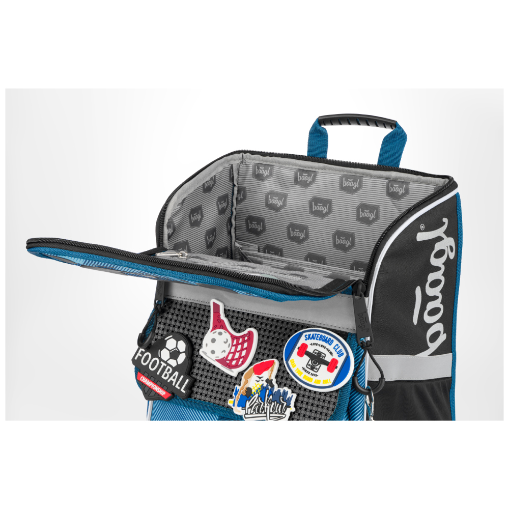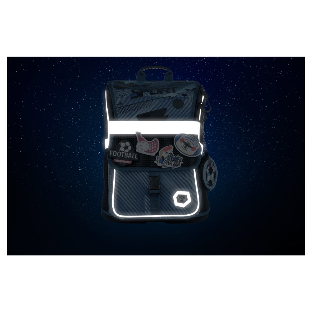 • Na klopu přední kapsy můžete libovolně připevňovat odznáčky, které jsou k aktovce jako dárek.