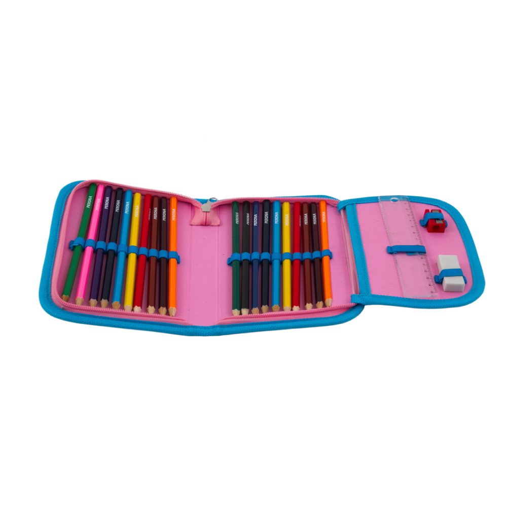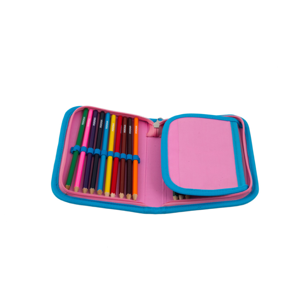 Součástí jsou pastelky, tužka, kuličkové pero, ořezávátko a guma.