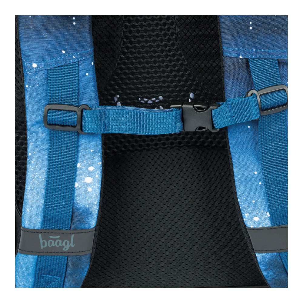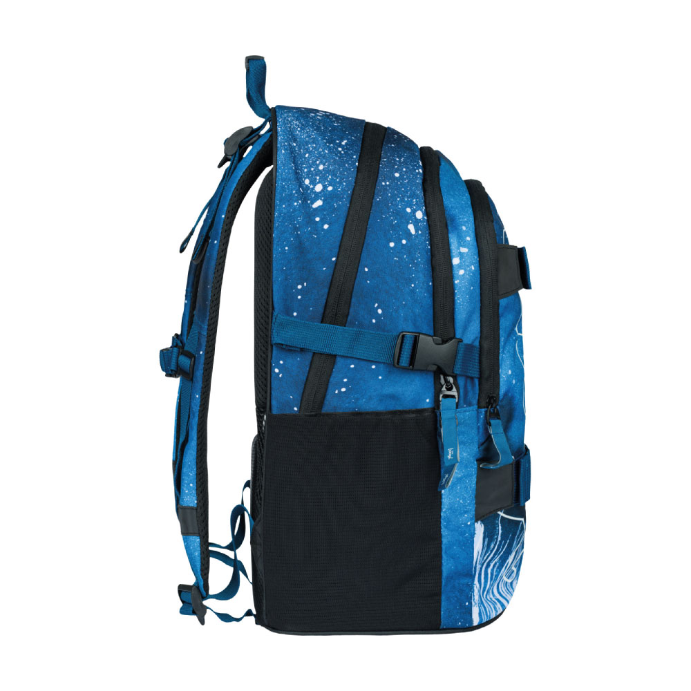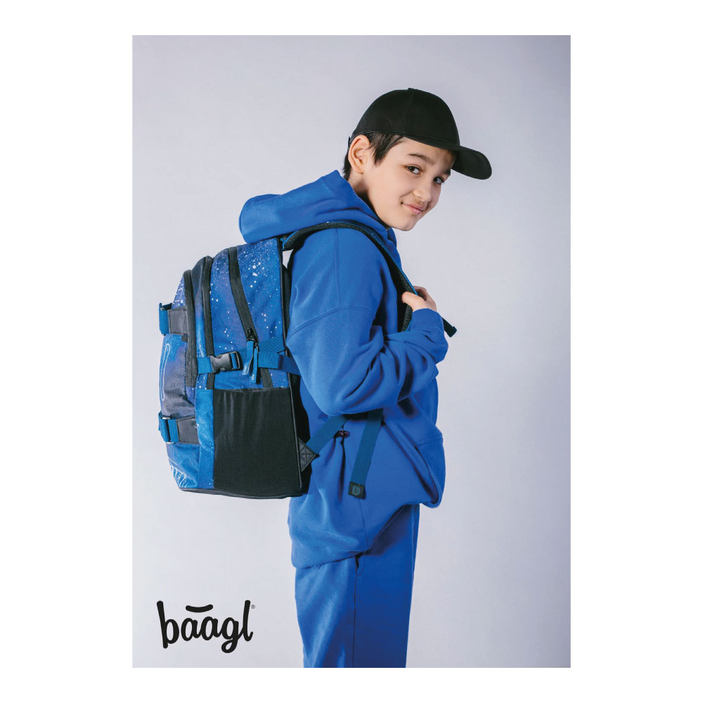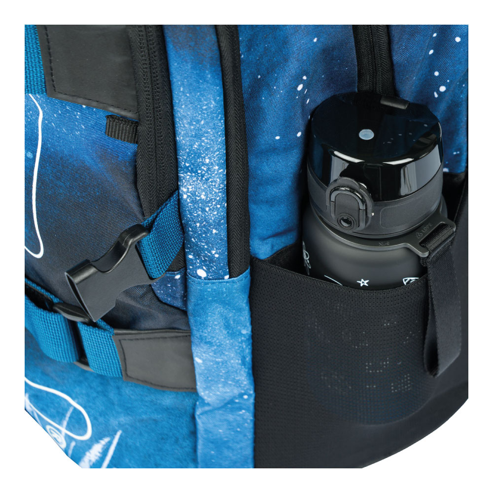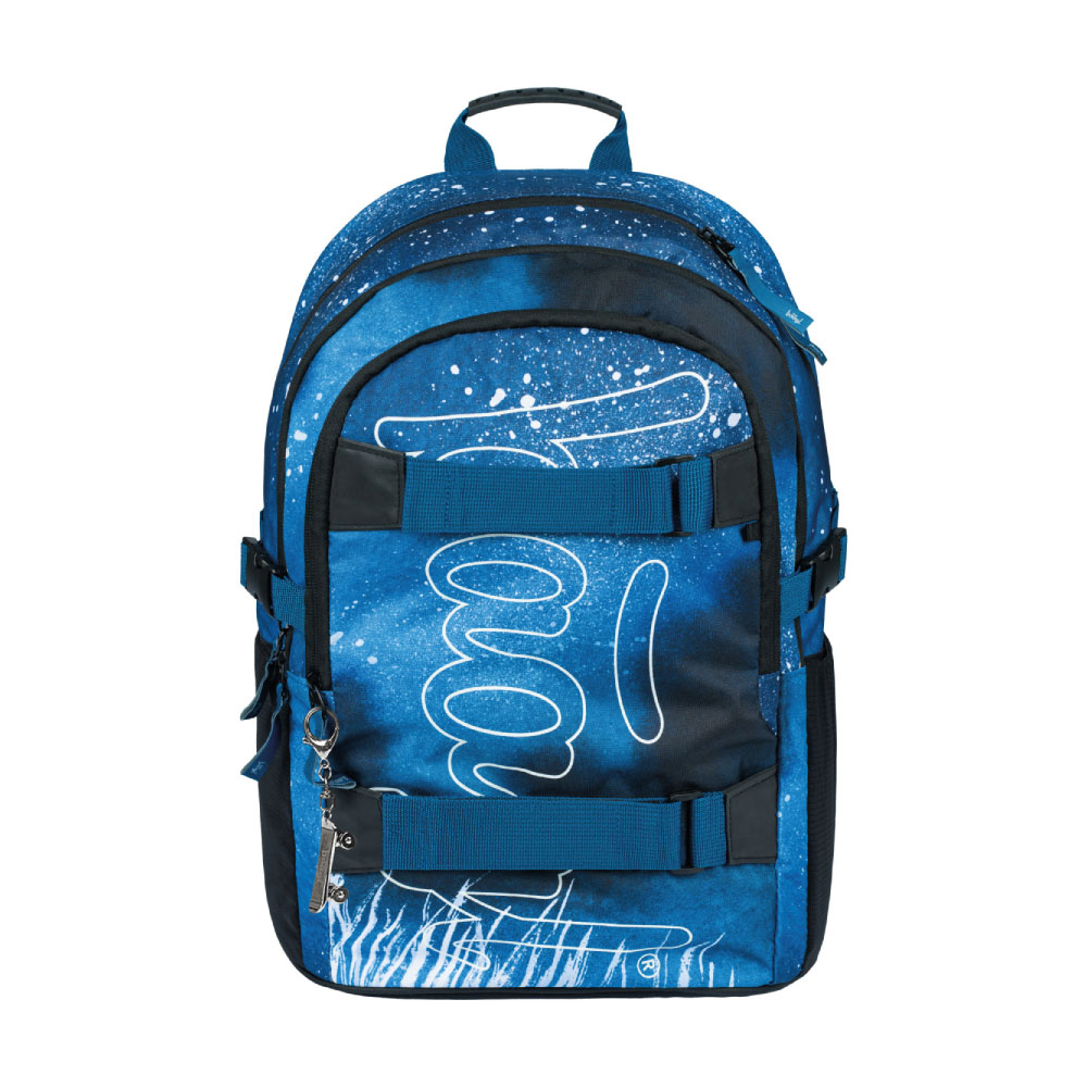 Ocelově modrý školní set obsahuje batoh z řady Skate, etui a nepostradatelný sáček na obuv, vhodný od 3. třídy