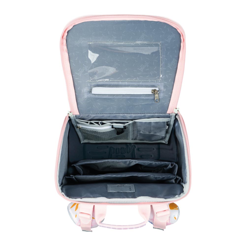 • Uvnitř aktovky je průhledná kapsa s rozvrhem a vnitřní organizér umožňující rovnoměrné rozložení hmotnosti, doplněný gumičkou pro fixaci.
