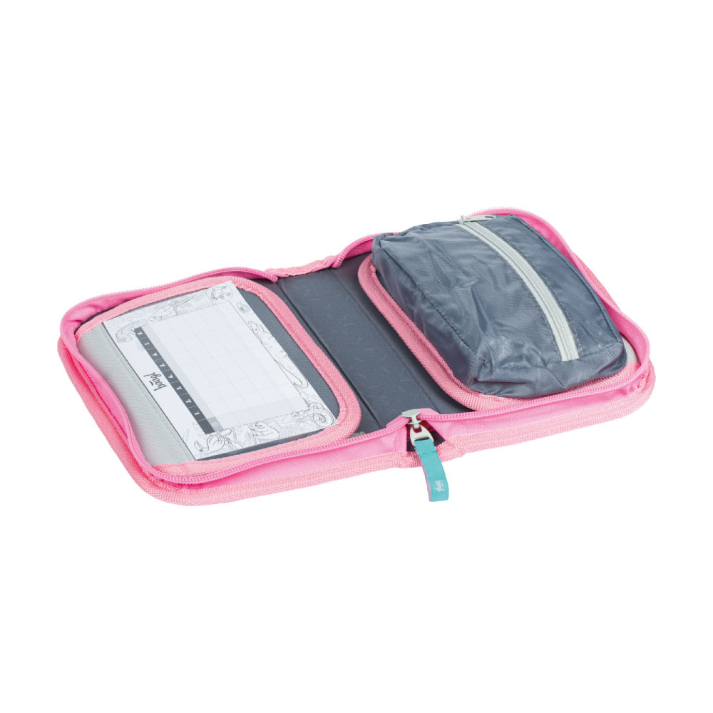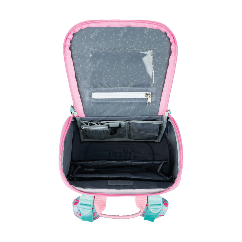 • Uvnitř aktovky je průhledná kapsa na rozvhr a vnitřní organizér umožňující rovnoměrné rozložení hmotnosti, doplněný gumičkou pro fixaci.