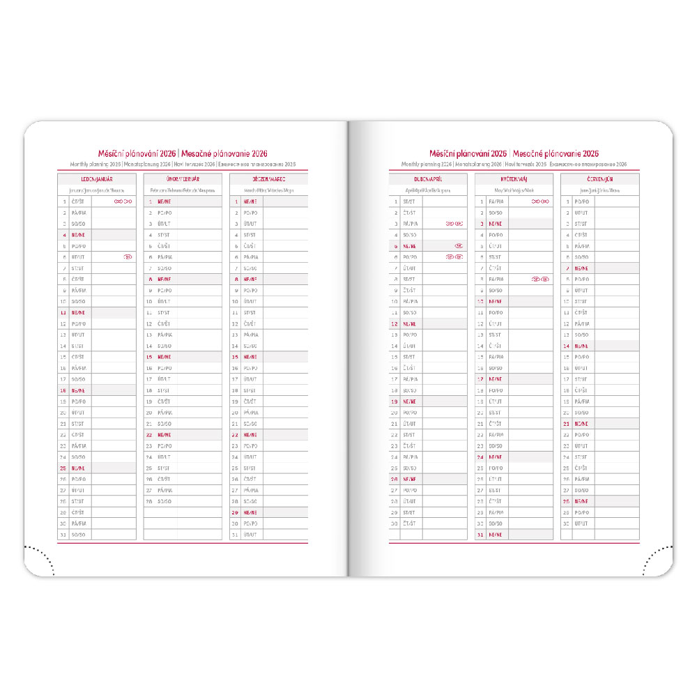 Diář obsahuje: místo pro osobní údaje, měsíční plánování 2026 a 2027,