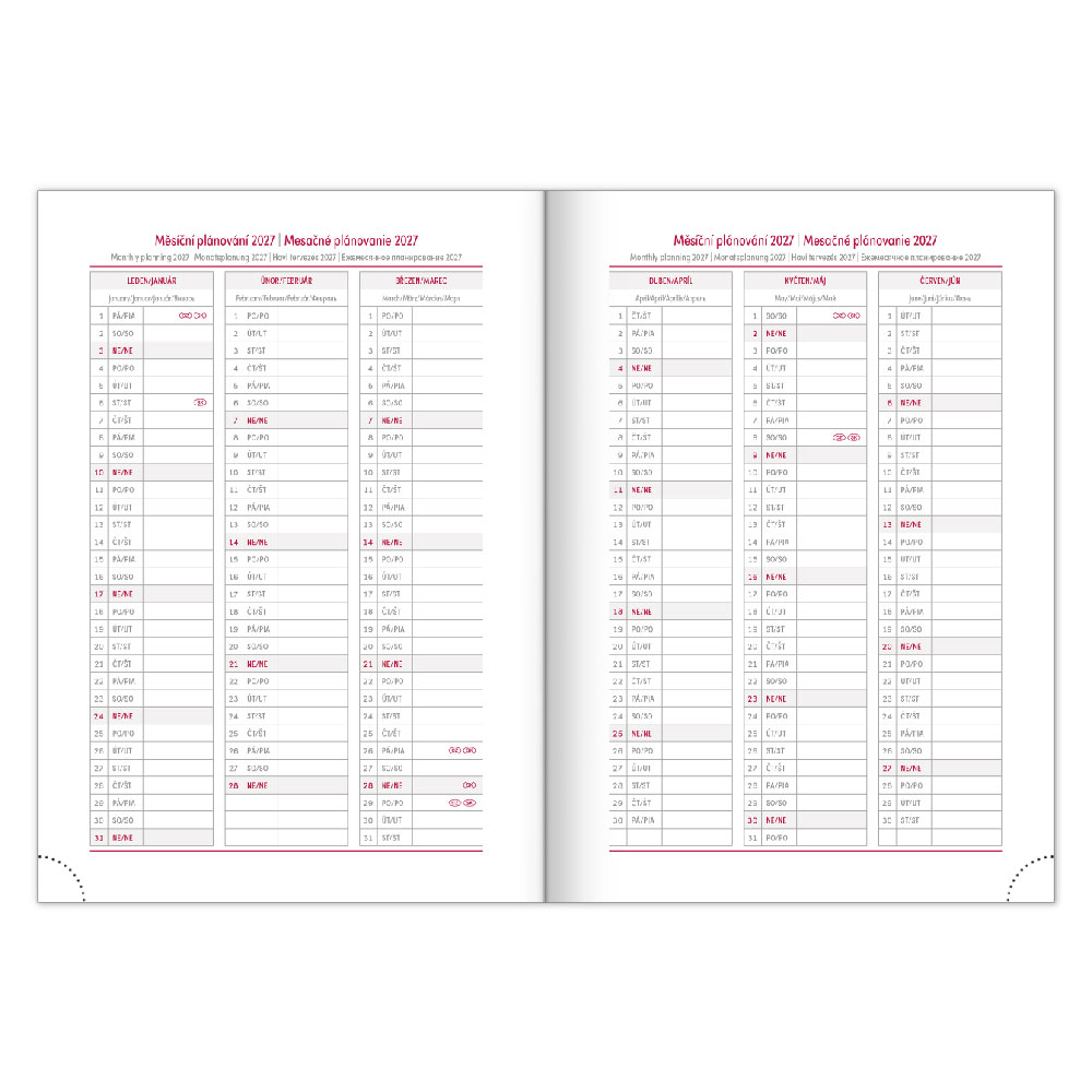 Diář obsahuje: místo pro osobní údaje, měsíční plánování 2026 a 2027,