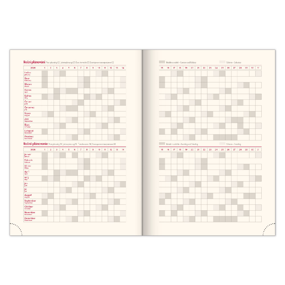 Diář obsahuje: místo pro osobní údaje, měsíční plánování 2026 a 2027,