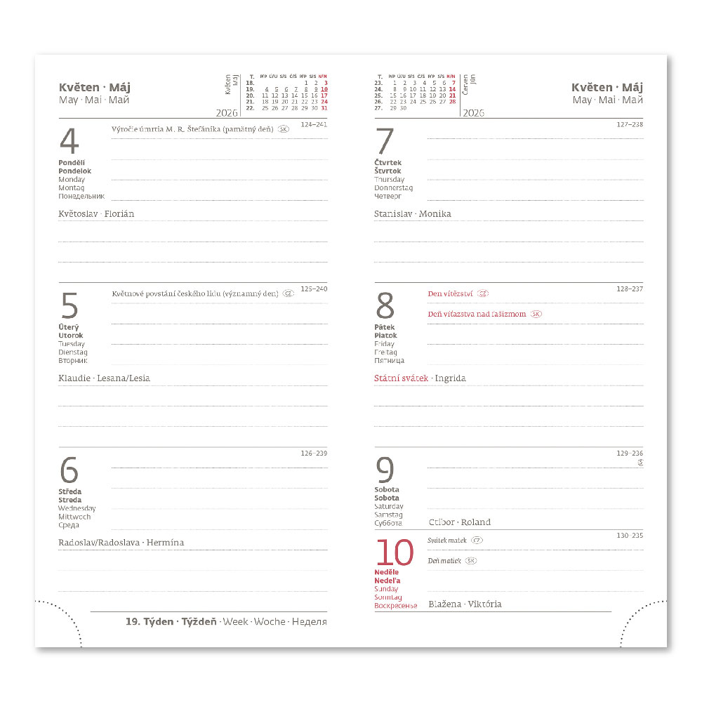 mezinárodní svátky, roční výhled, týdenní layout, adresář.