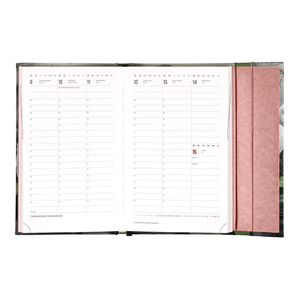 Součástí je záložka, poutko na tužku a vnitřní kapsa na navštívenky.