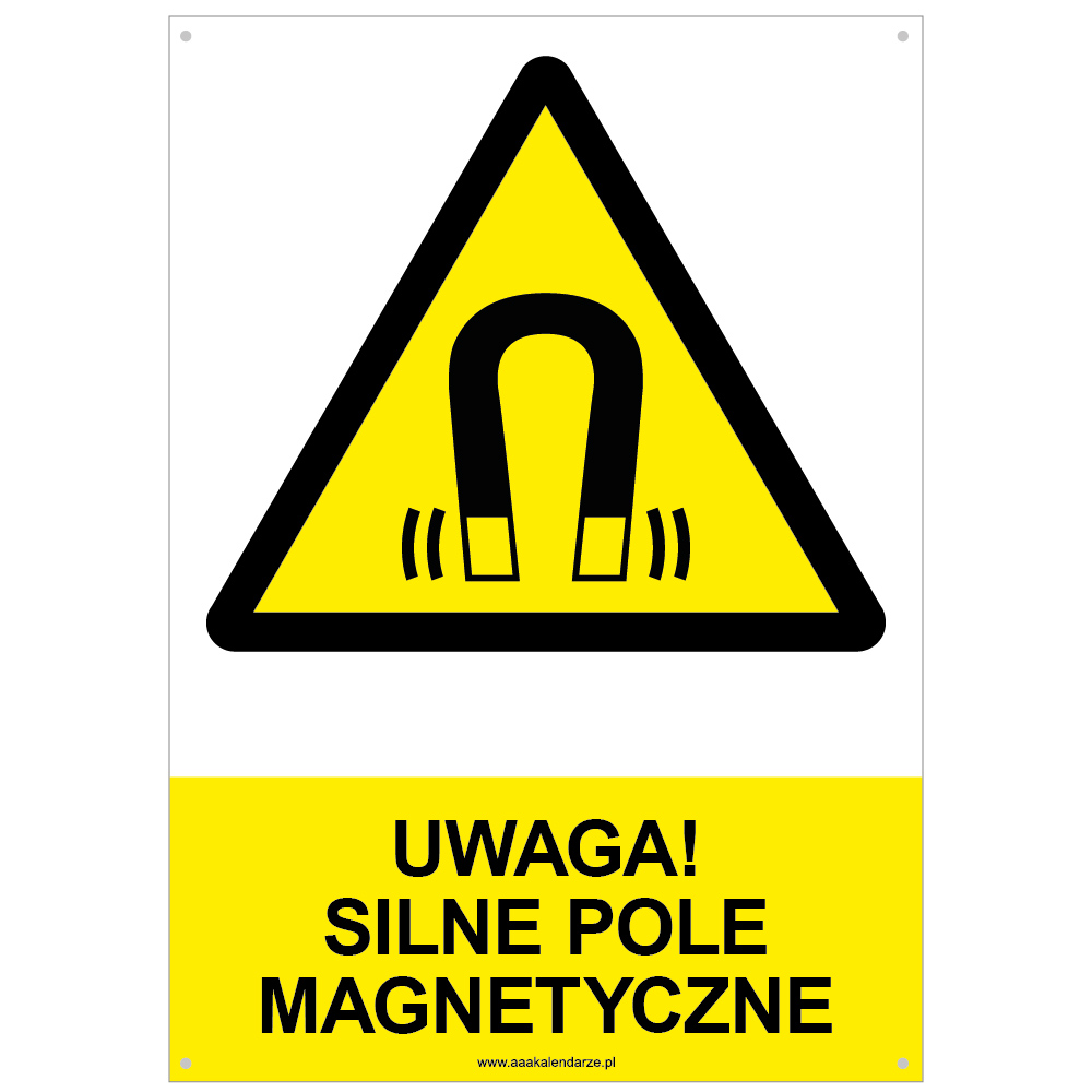 UWAGA! SILNE POLE MAGNETYCZNE - znak BHP z dziurkami, płyta PVC A4, 2 mm